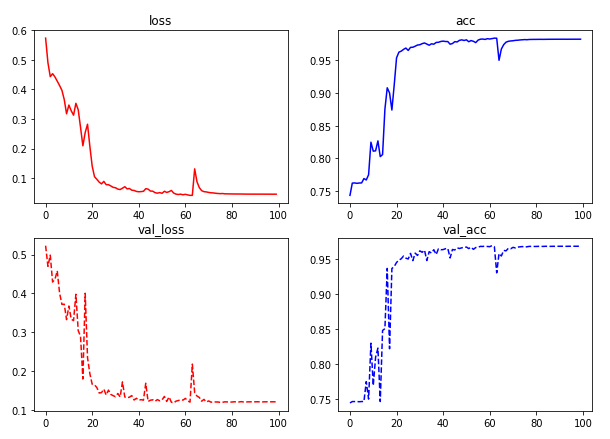 ax[1,0].set_title('val_loss') ax[1,0].plot(history.history['val_loss'],'r--') # validation loss에도 접근 가능 ax[1,1].set_title('val_acc') ax[1,1].plot(history.history['val_acc'], 'b--') # validation accuracy에도 접근 가능 --> 모두 접근하여 그래프를 그린다. # 1행이 트레이닝 결과 # 2행이 밸리데이션 결과 |