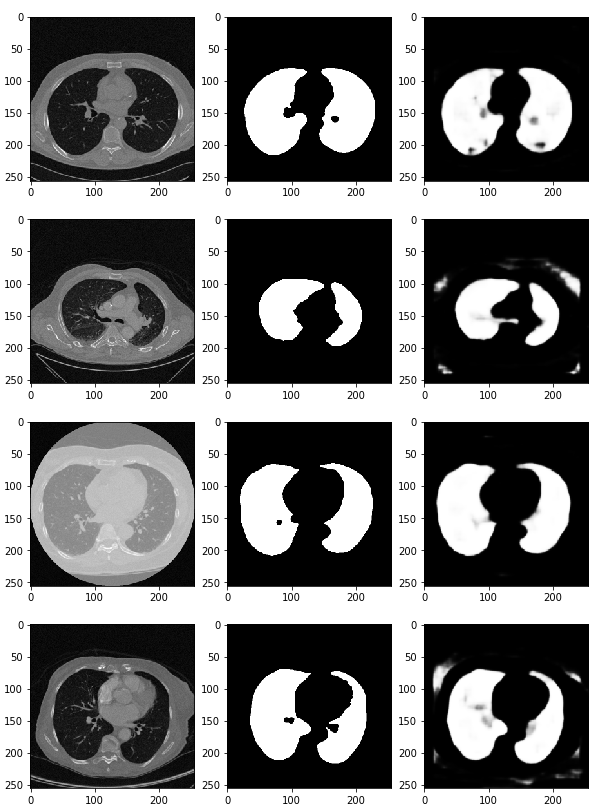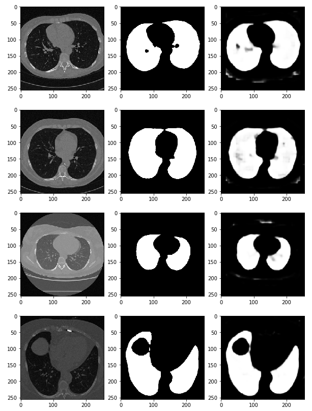 for i, pred in enumerate(preds): ax[i, 0].imshow(x_val[i].squeeze(), cmap='gray') # 첫 번째 열에는 CT 데이터(x_val[i])를 삽입 ax[i, 1].imshow(y_val[i].squeeze(), cmap='gray') # 두 번째 열에는 정답 데이터를 넣는다. ax[i, 2].imshow(pred.squeeze(), cmap='gray') # 세 번째 열에는 우리가 예측한 결과값을 그려본다.