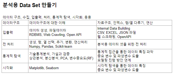 df = pd.DataFrame(dict_data, index=['데이터구조', '입출력', '전처리', '통계적 탐색', '시각화'])