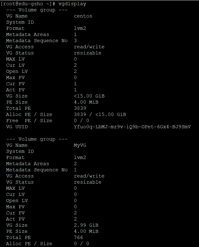 vgdisplay로 상세 볼륨그룹 정보 확인 가능