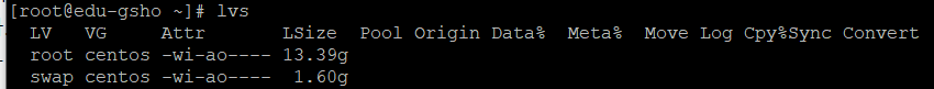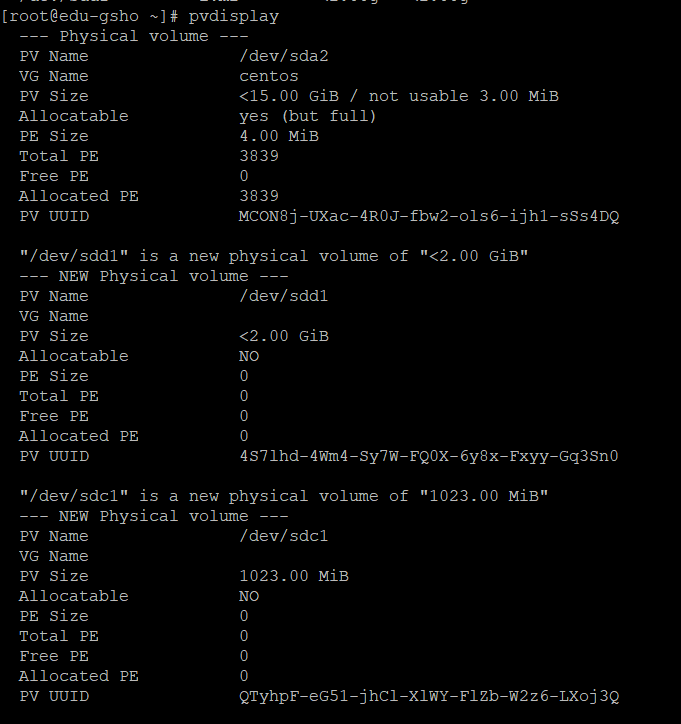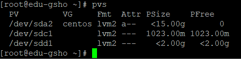 sda2 는 os가 자동으로 구성한것이다.(pvs는 간략하게 확인, pvdisplay라는 명령어로 세부적 확인 가능)