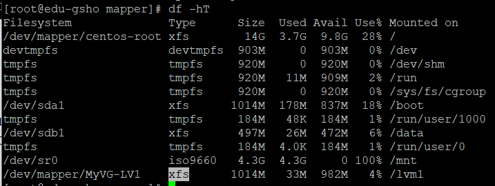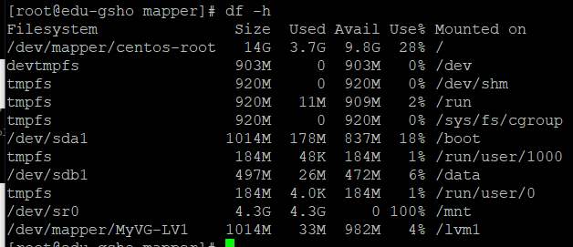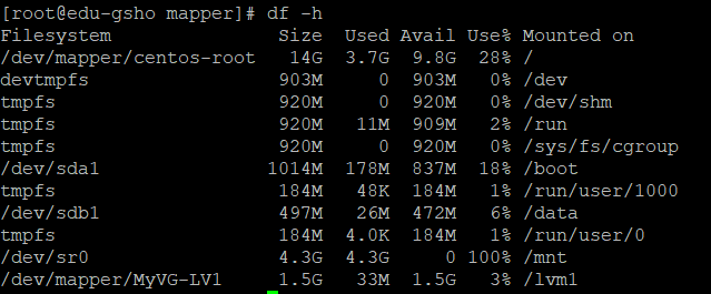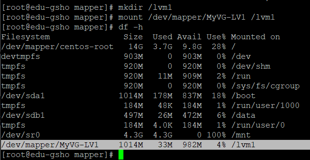 lvm1 에 정상적으로 마운트 된 논리적인 볼륨을 확인할 수 있다.