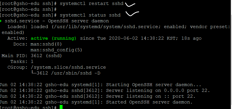 - ‘systemctl restart sshd’ à ‘systemctl status sshd’ 명령어로 재실행 후 상태 확인